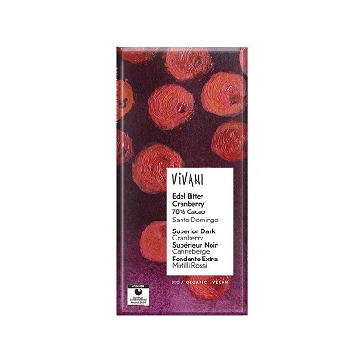70 % kakao från Dominikanska republiken. Med bitar av tranbär. Ekologisk & vegansk choklad. Tunnt format för intensiv smak