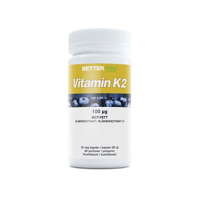 Better You Vitamin K2 innehåller 100 µg K2 (MK-7). Vitamin K bidrar till normal benstomme & normal blodkoagulation. Med MCT från kokos & blåbärsextrakt 4:1.