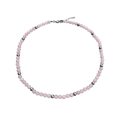 Rosenkvarts kallas ofta för kärlekens sten och förknippas med självkärlek, harmoni och känslomässig balans. Halsbandet är 50 cm långt och har detaljer i rostfritt stål. Varje pärla är unik.